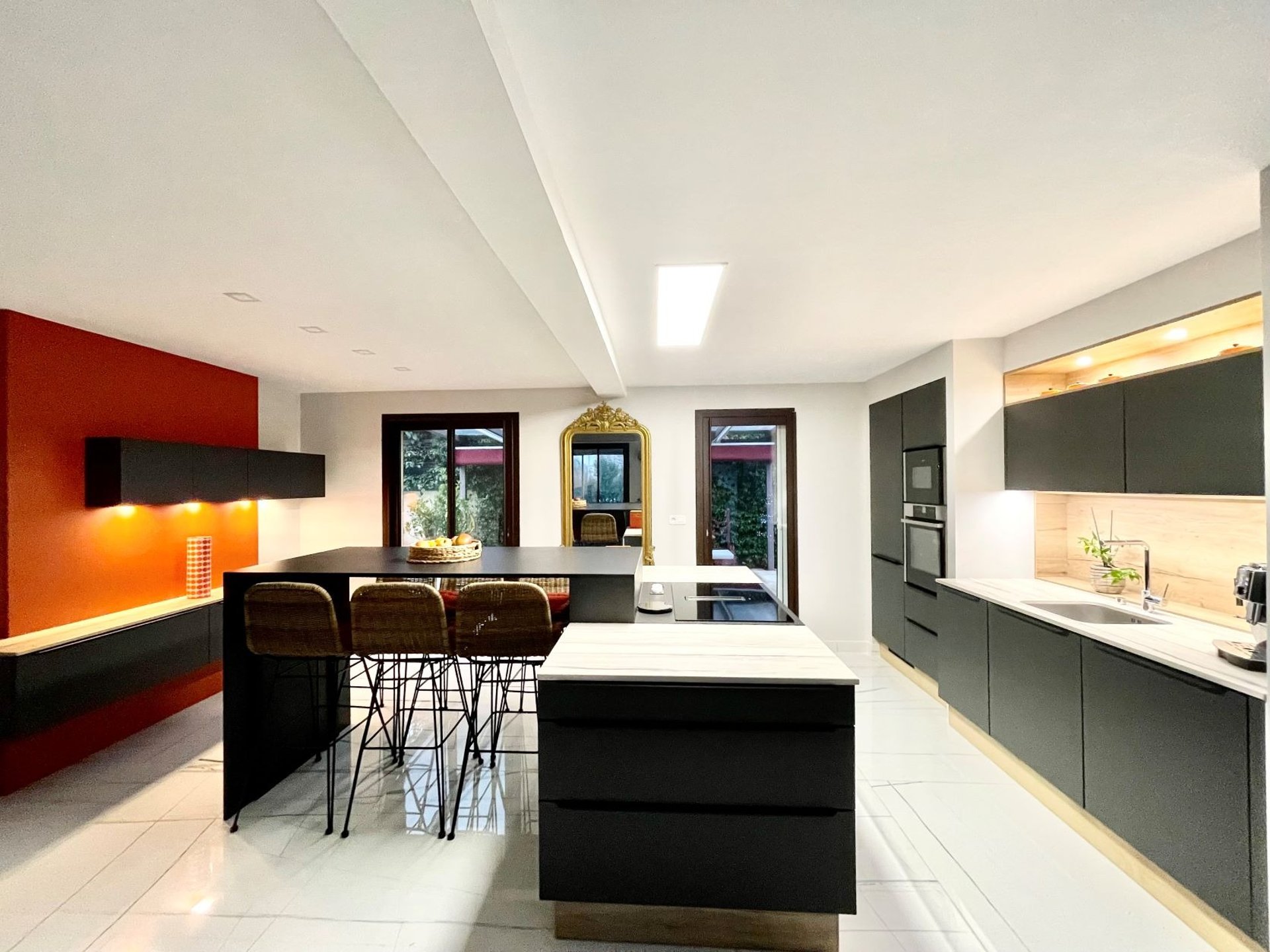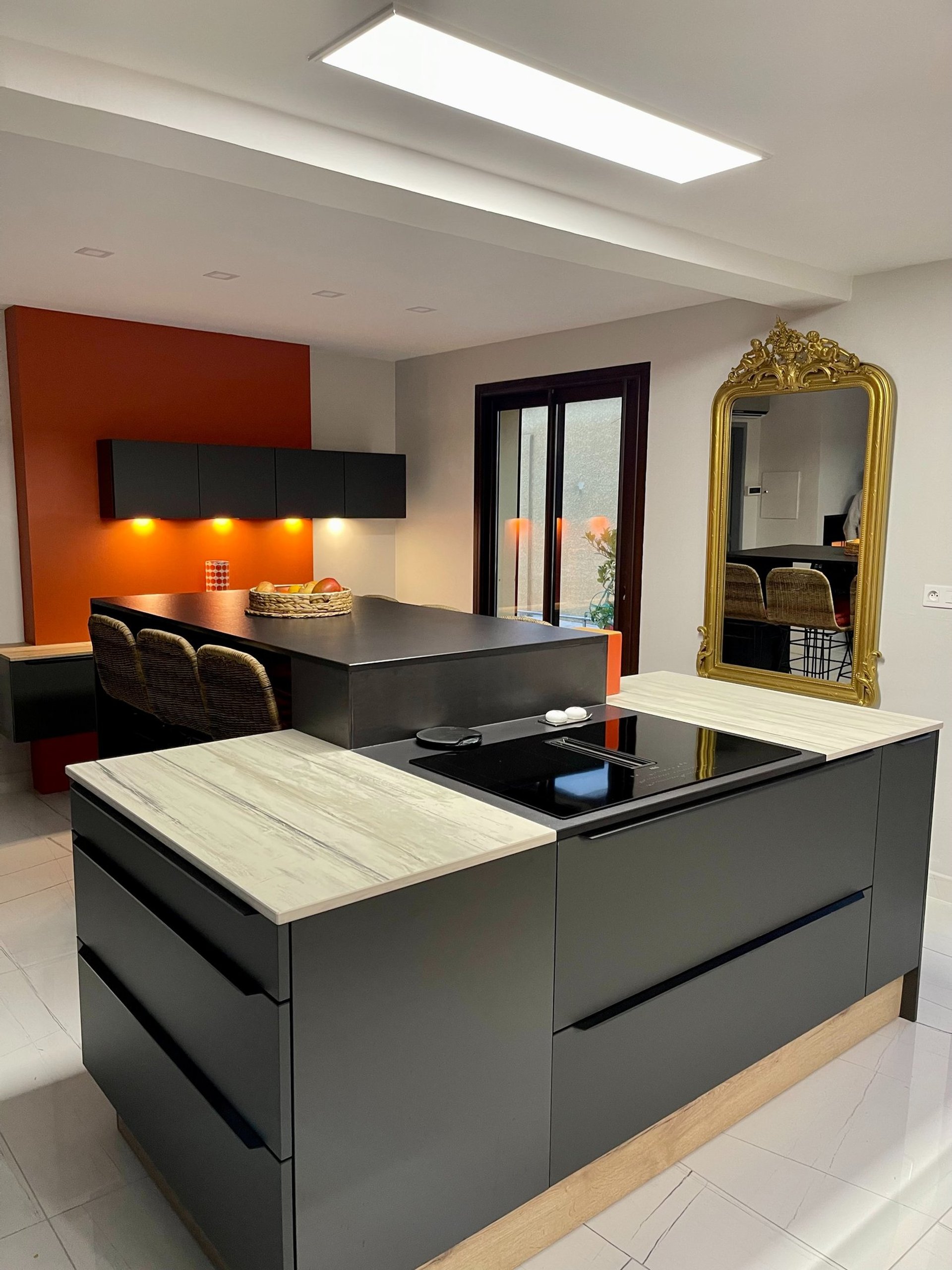 Ce projet de rénovation a été conçu pour créer une cuisine à la fois pratique et au design audacieux. L'agencement a été pensé autour d'un îlot central intégrant un plan de cuisson, du rangement et une table conviviale pouvant accueillir jusqu'à six personnes.